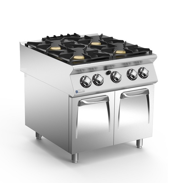 Apparecchiatura composta da n° 4 bruciatori principali con potenza massima di n°3 da 6 kW, n°1 da 10 kW, fissati ermeticamente al piano. Piano stampato. Dotata di griglie in ghisa smaltate resistenti agli acidi, agli alcali e alla fiamma. Grado di protezione IPX5.