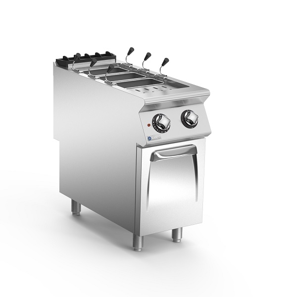Piano superire di 2 mm. di spessore. Vasca stampata in acciaio inox AISI 316. accensione automatica mediante dispositivo elettrico. Regolatore di energia per un più efficace controllo della bollitura. Capacità della vasca 42 Lt. Scarico acqua mediante rubinetto posto all’interno della base. Grado di protezione IPX5.