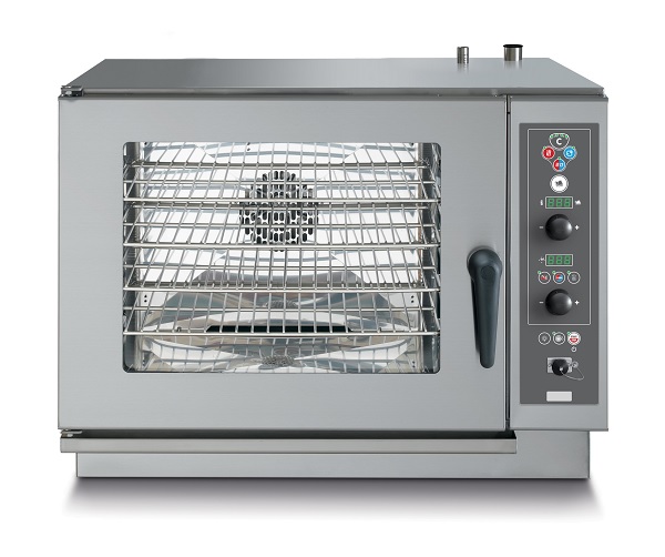 Forno a convezione gas. Elettromeccanico standard con comandi manuali. Capacità camera di cottura: 4 x GN1/1. In dotazione paratie portagriglie fissa e griglia inox. Supporto non fornito
