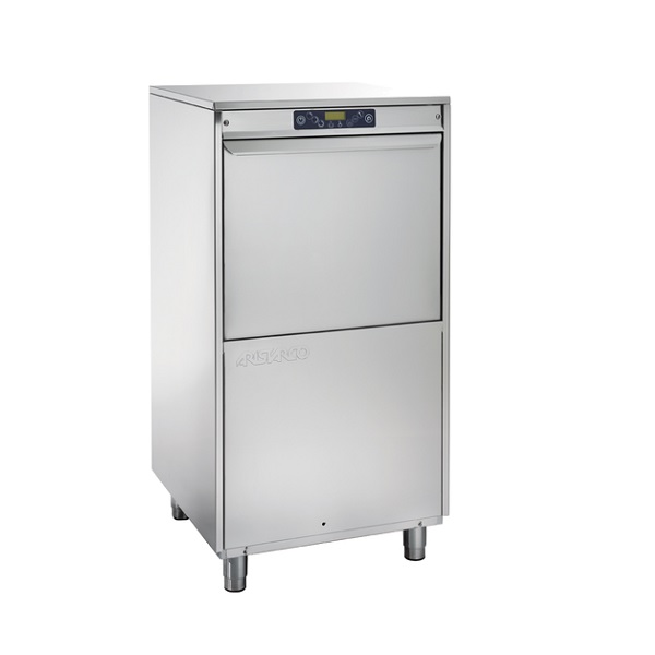 Lavastoviglie a carica frontale adatta al lavaggio di piatti con diametro fino a 34 cm. Macchina dotata di sistema carico acqua automatico, sicurezza porta, risciacquo a caldo controllo termostatico boiler e vasca, e dosatore del brillantante. Cestello cm. 50×50. Alimentazione elettrica 380V (3F+N), potenza 5.3 Kw